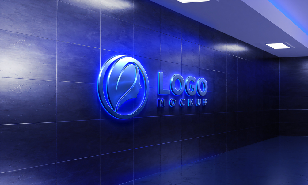 Realistic Sign Wall Blue Light Neon Logo Mockup